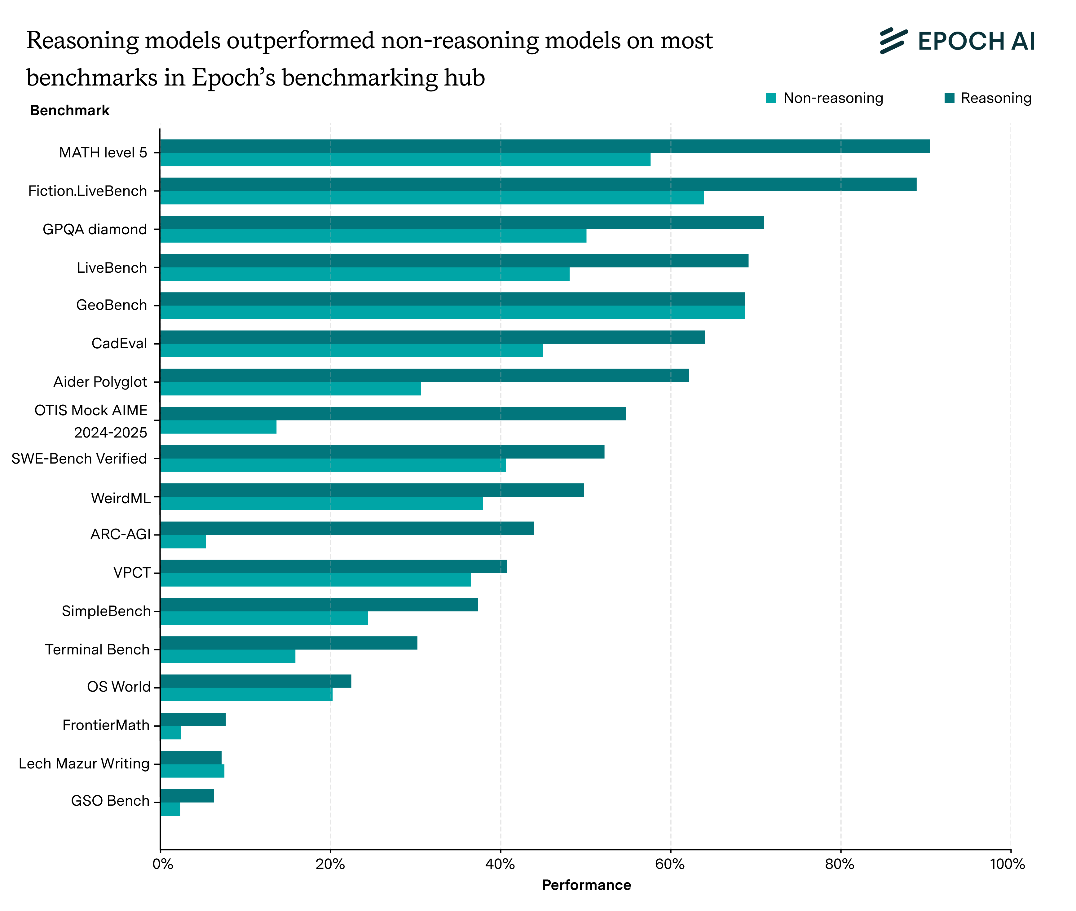 However, we think that the fraction of benchmark tasks where we see almost no benefit is likely to be quite small. To see this, we can look through all the benchmarks in Epoch’s benchmarking hub, and identify the performances of all the reasoning/non-reasoning model pairs.9 If we average the performances of the reasoning models and the non-reasoning models separately, we can see which benchmarks tended to be amenable to reasoning.