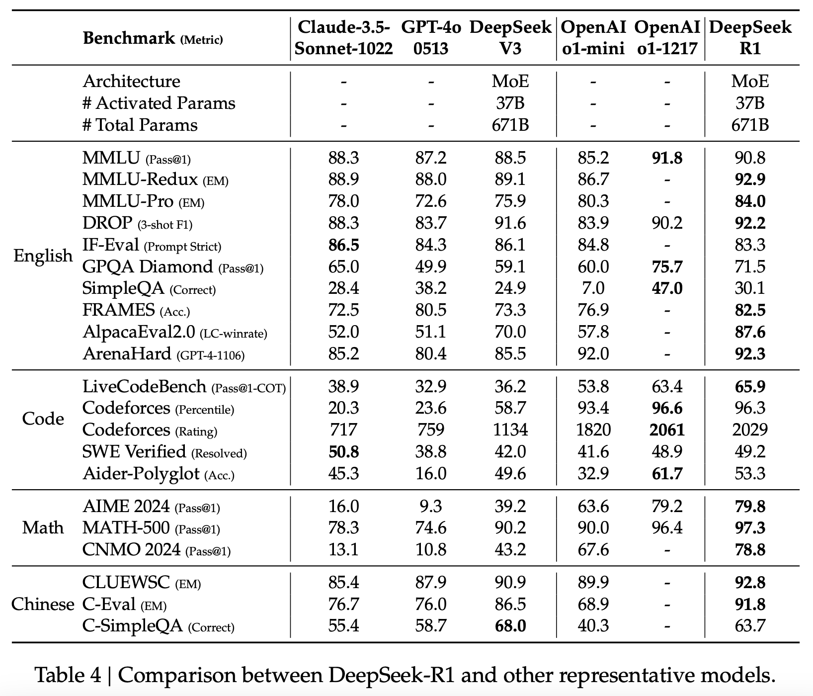 Figure 2: Table comparing DeepSeek-R1 and other representative models. From the DeepSeek R1 technical report.