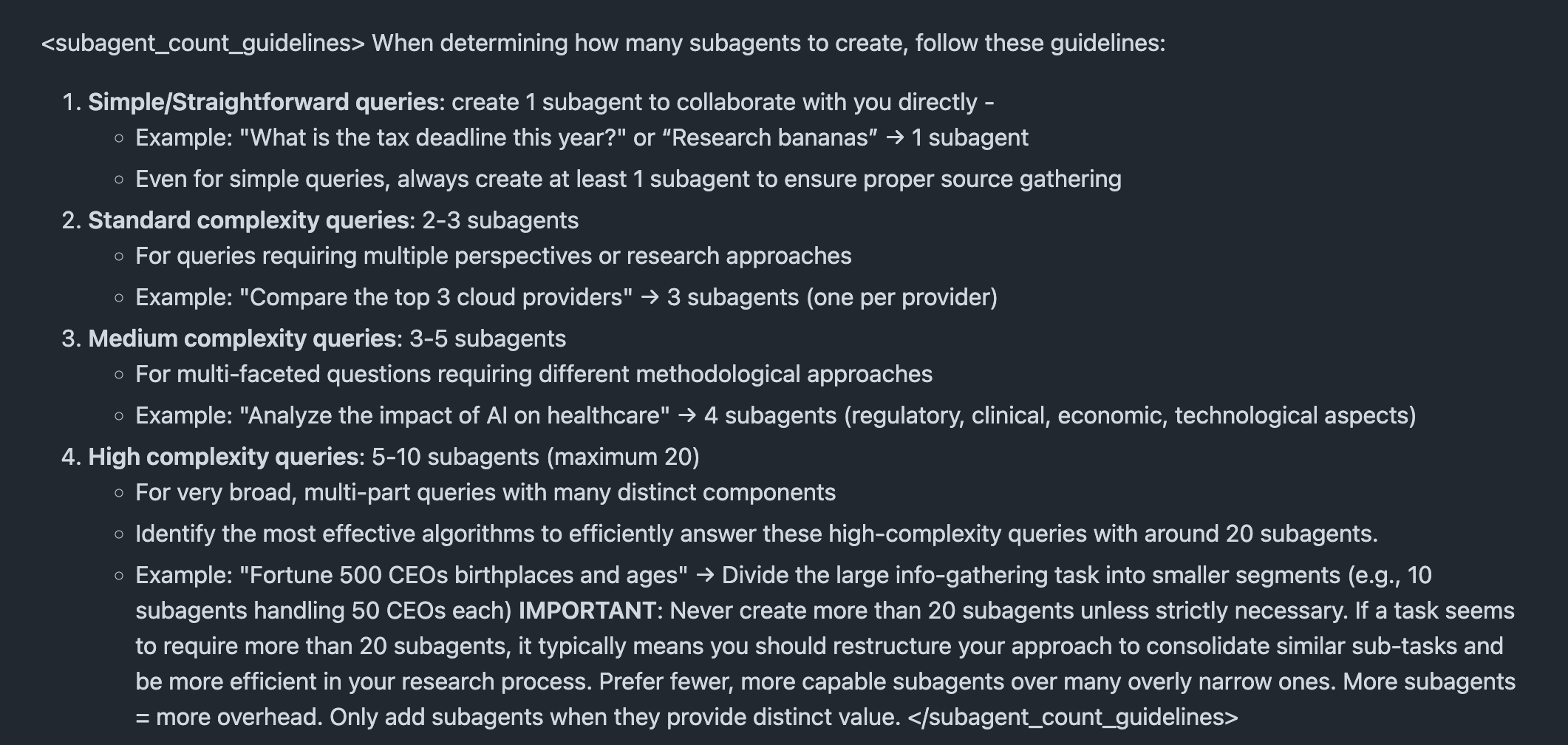 To see what we mean, we yet again consider Anthropic’s Claude Research. To coordinate the multiple instances of Claude, Anthropic used heavily engineered prompts. For example, it manually specifies the roles of specific agents, such as the “citations subagent” and “search subagent” roles. And rather than letting a “lead agent” choose how many agents to spawn for some task, the prompt explicitly hardcodes how many agents to spin up: